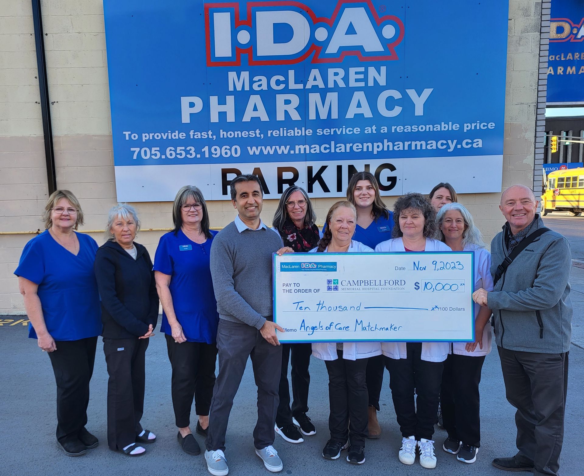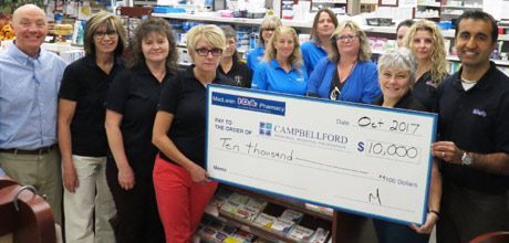 Pharmacist Arif Popatia and the staff of MacLaren IDA Pharmacy present Campbellford Memorial Hospital Foundation Executive Director John Russell (far left) with a gift of $10,000 to help purchase critically needed patient care equipment for the hospital.
