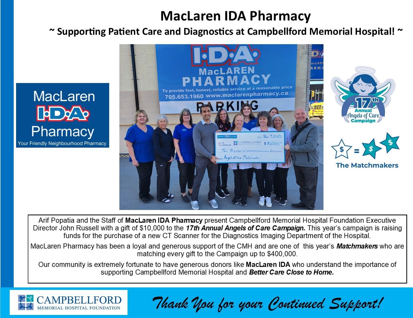 The current priority needs of the hospital include a coagulation analyzer for the lab and a portable ultrasound machine for the emergency department. Our community is extremely fortunate to have generous donors like MacLaren IDA who understand the importance of supporting Campbellford Memorial Hospital.